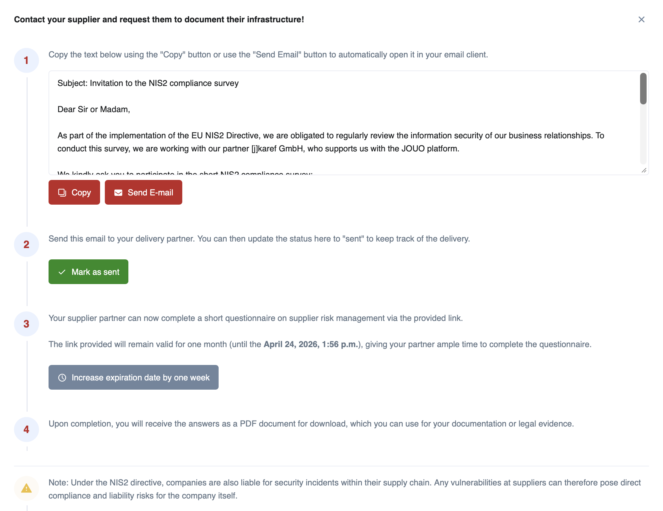 To fulfill your documentation requirements (e.g., under NIS-2), you can ask your suppliers to complete a questionnaire regarding their risk management.