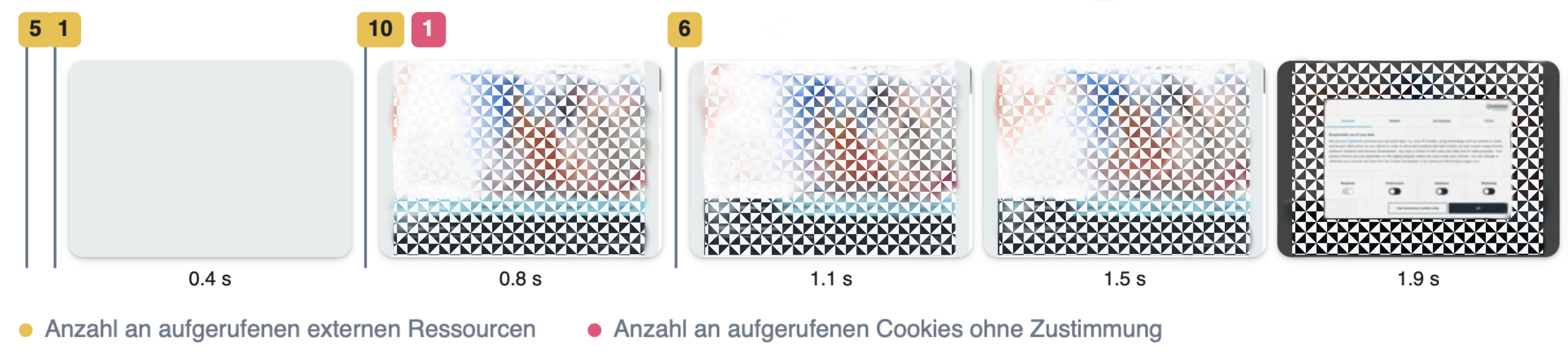 Du siehst, wann auf deiner Startseite visuell was lädt und vor allem, wann dabei externe Seiten im Hintergrund aufgerufen und Drittanbieter-Cookies gesetzt werden. Im gegebenen Beispiel sieht man gut, dass bei 0,8 Sekunden bereits ein Cookie aufgerufen wurde (die rote Eins), wobei das Consent-Banner zum Akzeptieren der Cookies erst nach 1,9 Sekunden im letzten Screenshot geladen wurde.