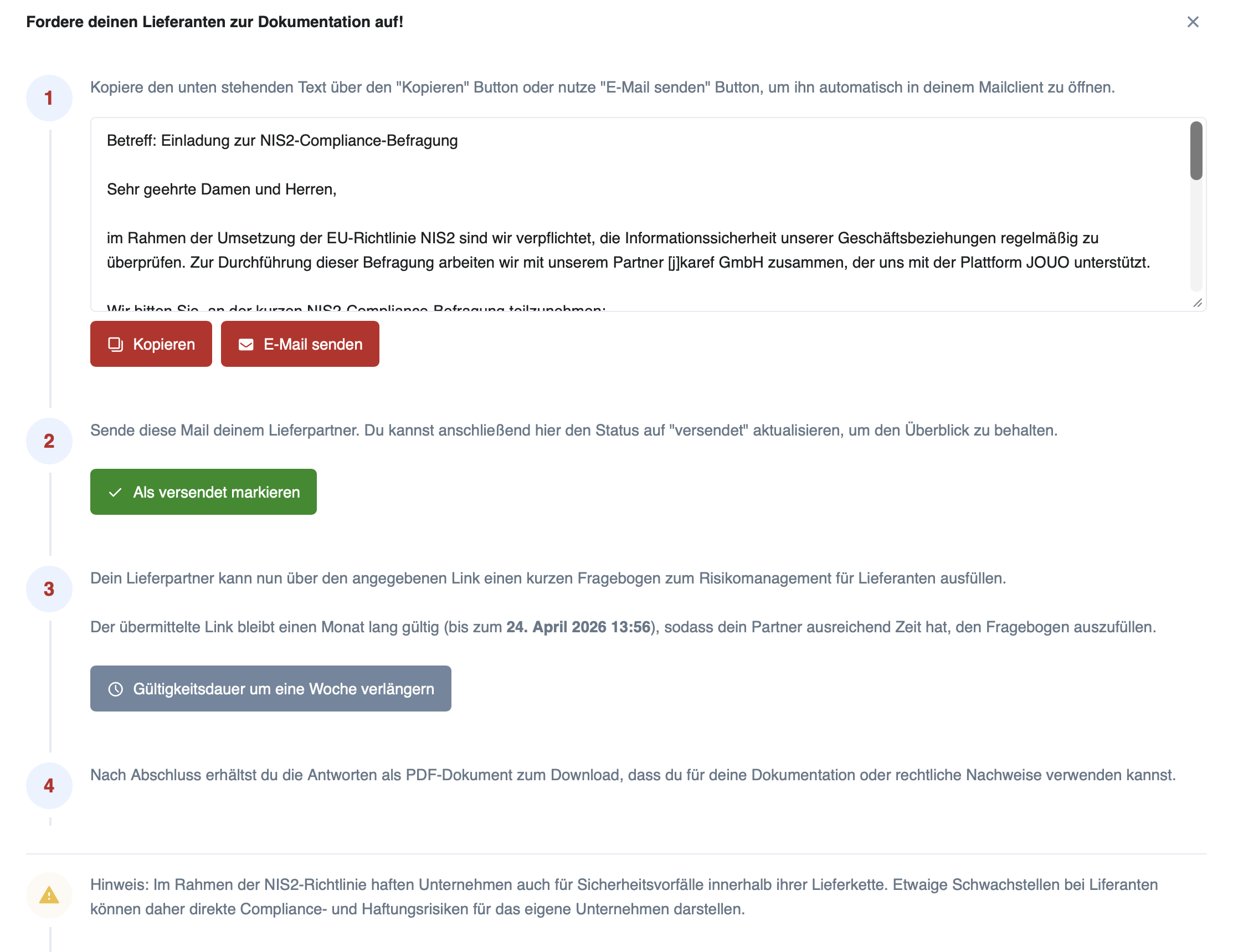 Um deiner Dokumentationspflicht (z.B. durch NIS-2) nachzugehen, kannst du deine Lieferanten auffordern, einen Fragebogen zu deren Risikomanagement auszufüllen.